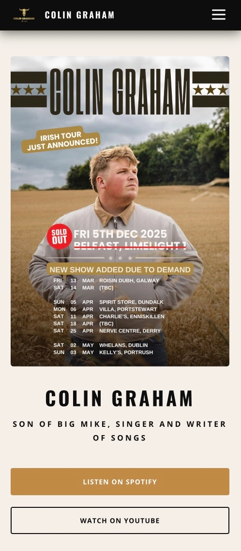 Learn MoreA complete digital hub for Northern Ireland's rising country music star and built to drive discovery, ticket sales, and fan engagement.